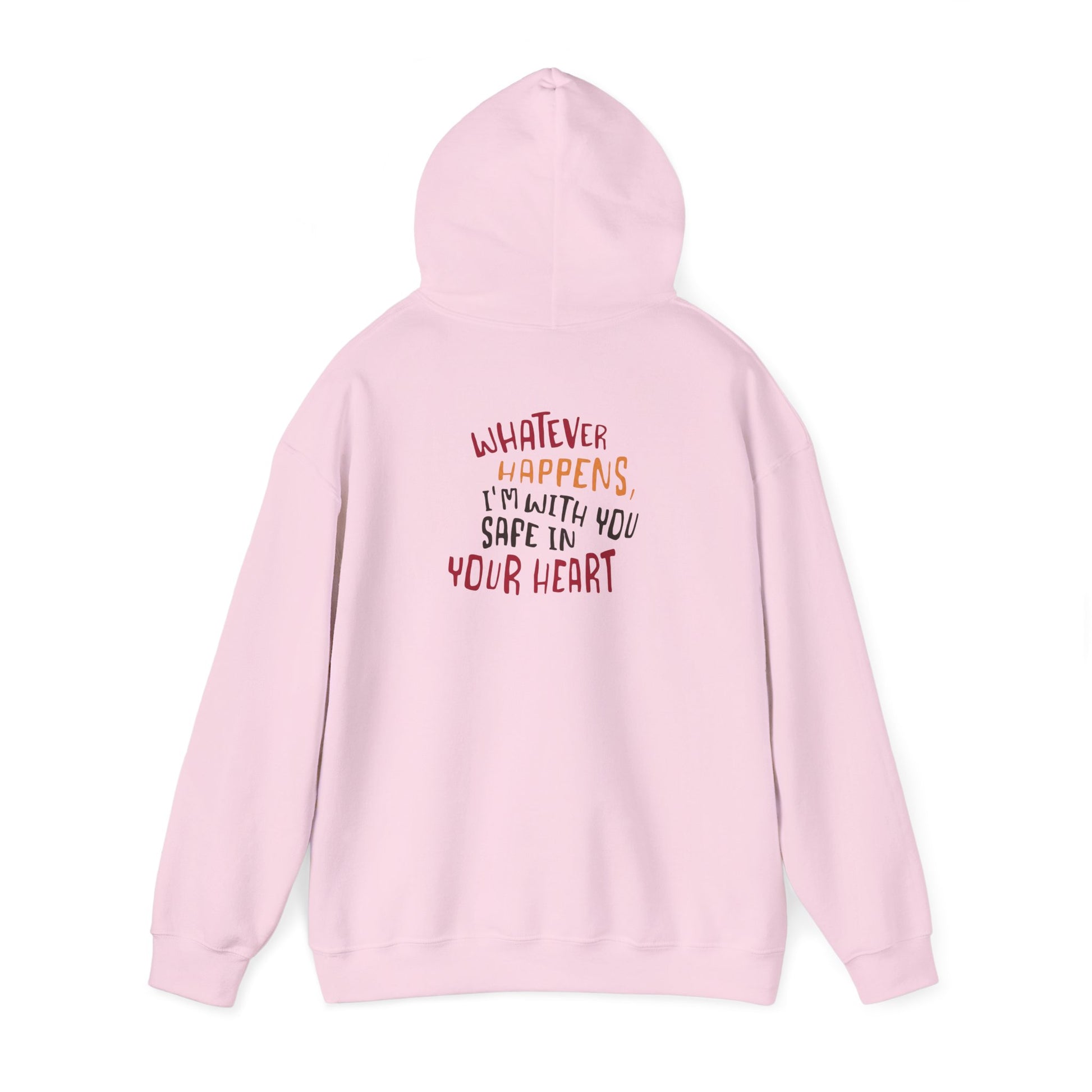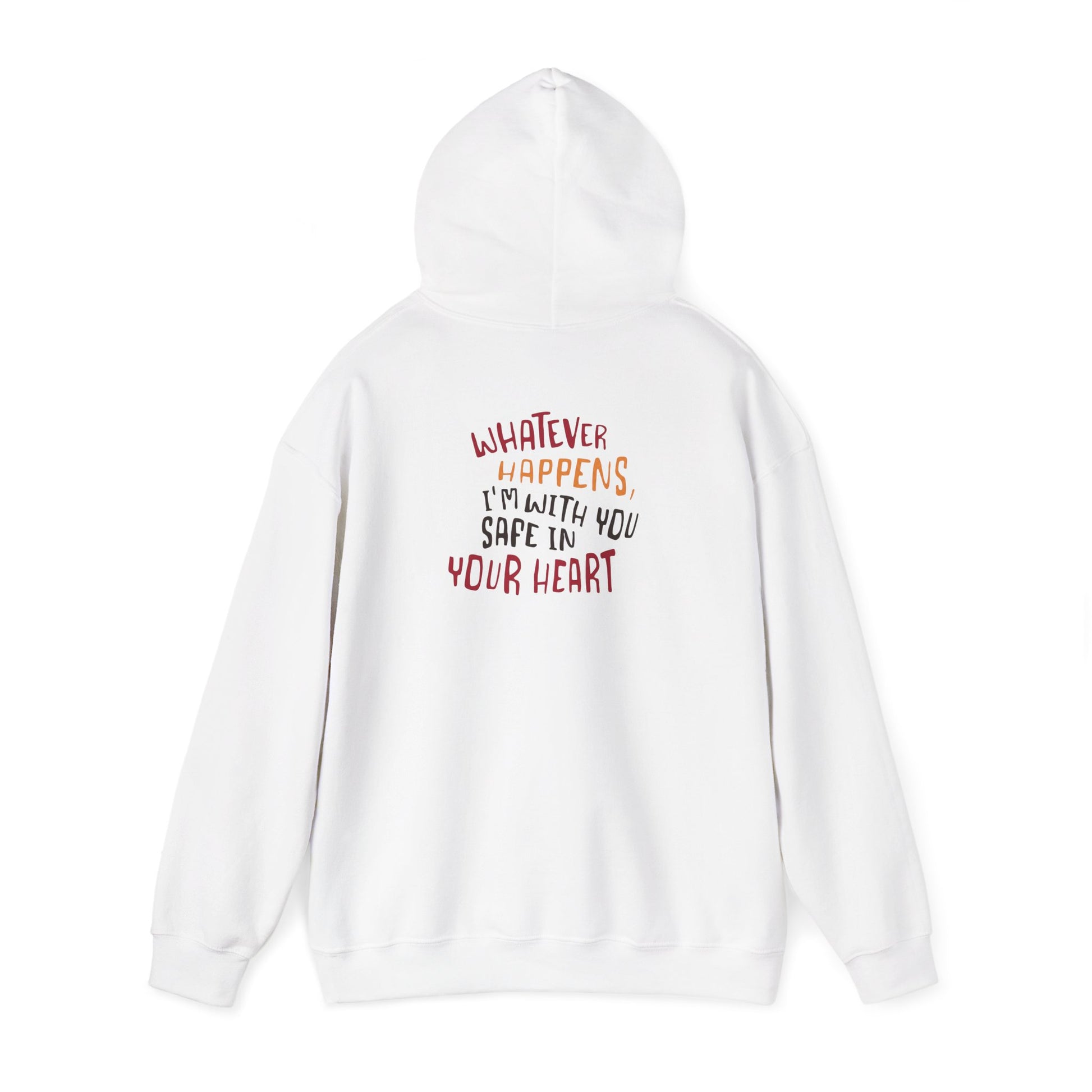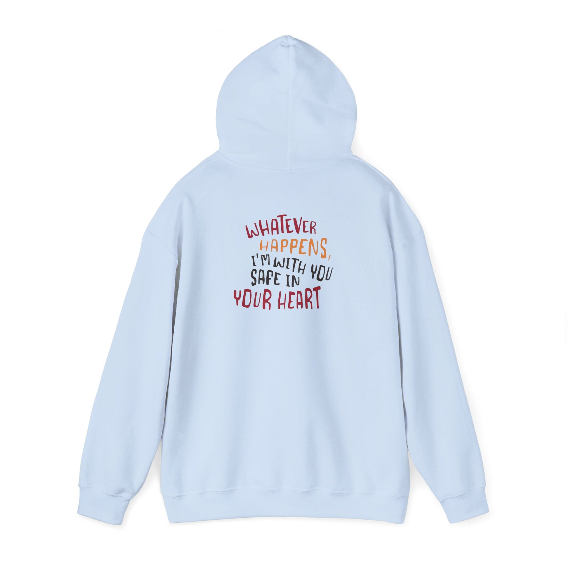 Whatever happens, I am with you. Safe in your heart” is printed on a classic hoodie.